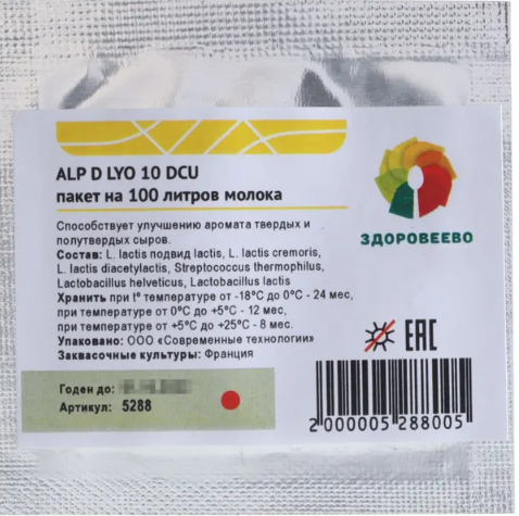 Cостав: Lactococcus lactis подвид lactis, Lactococcus Lactis подвид cremoris, Lactococcus Lactis подвид diacetylactis, Streptococcus thermophilus, Lactobacillus helveticus, lactobacillus lactis.