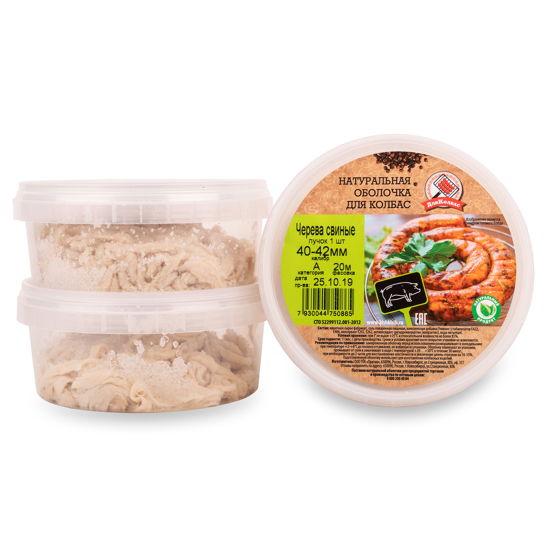 Натуральная оболочка свиная 40/42 мм — подходит для приготовления копченых, вареных и сыровяленых колбасных изделий.