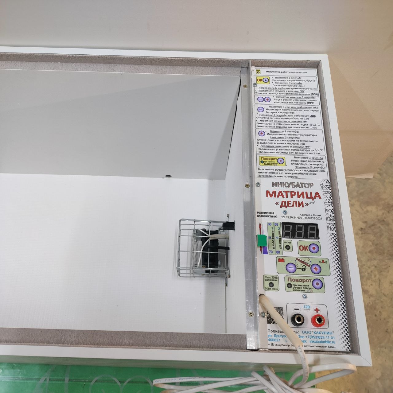 - Питание от сети и от аккумулятора. Инкубатор сам подзаряжает аккумулятор.