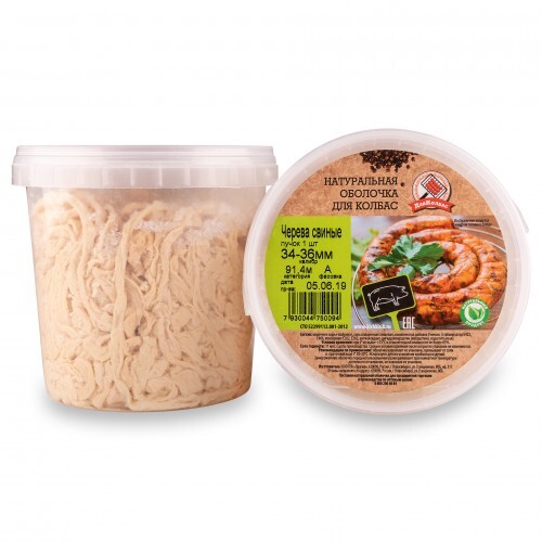 Натуральная оболочка свиная 40/42 мм — подходит для приготовления копченых, вареных и сыровяленых колбасных изделий.