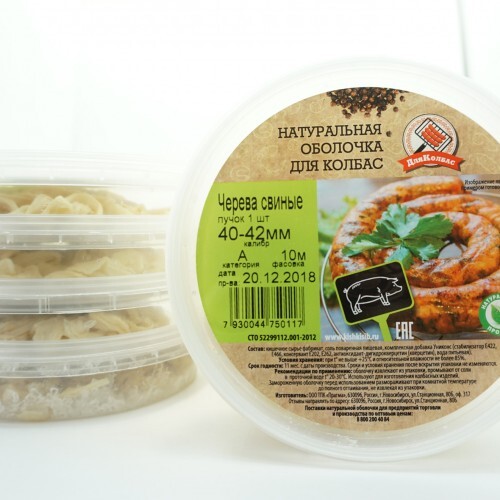 Натуральная оболочка свиная 40/42 мм — подходит для приготовления копченых, вареных и сыровяленых колбасных изделий.