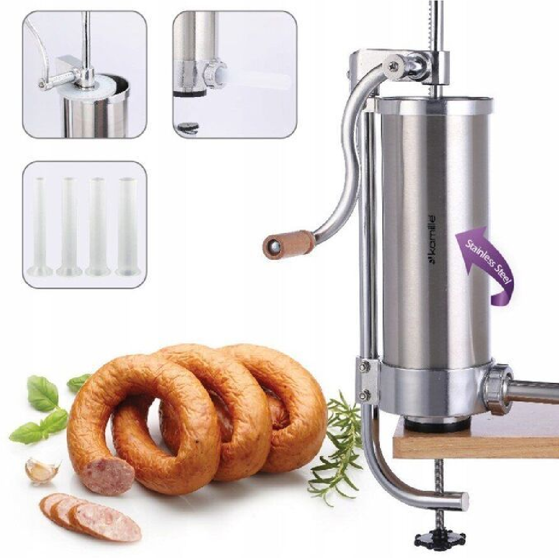 Шприц является вертикальным и занимает мало места на столешнице, что делает его незаменимым в производстве домашних колбас.
