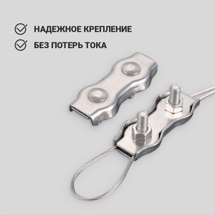 Это высококачественный зажим, изготовлен из оцинкованной стали, что обеспечивает высокую прочность, устойчивость к внешним воздействиям.