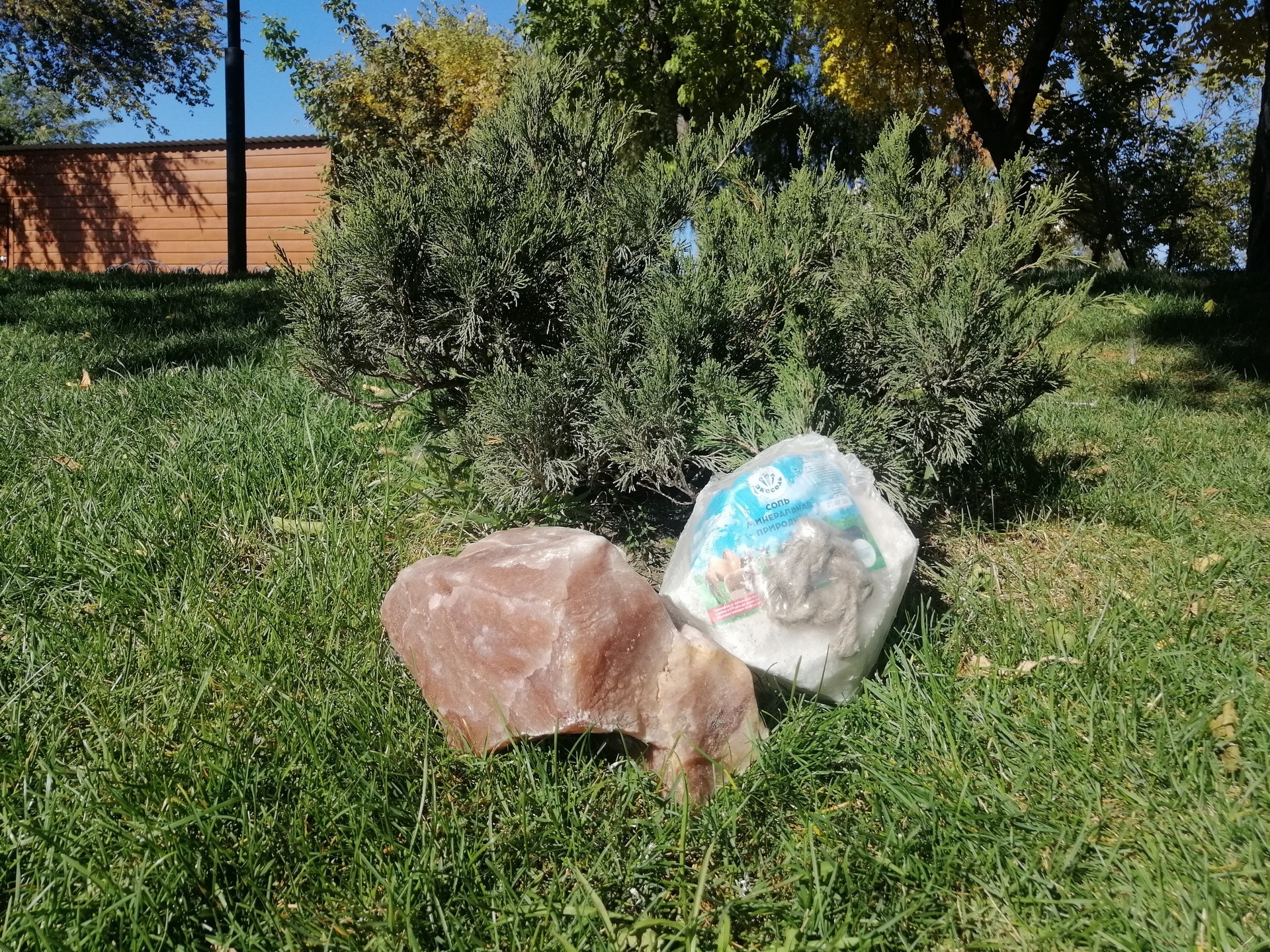 Соляной гималайский лизунец изготавливается с отверстием и упаковывается в индивидуальную пленку с веревкой из природных материалов.