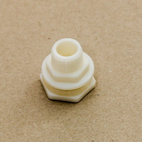 Врезка в бак, 1/2 дюйма, пластиковая с наружной резьбой. Врезается в бак (емкость), выполняет функцию соединительного патрубка (отвода), с возможностью накручивания на свою резьбу дополнительных фитингов.